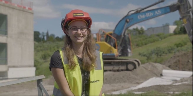 Martine er 23 år og har svennebrev som tømrer. Vi får bli med henne på byggeplassen på Norges miljø- og biovitenskapelige universitet (NMBU) i Ås der hun jobber som prosjektingeniør med driftsansvar.
